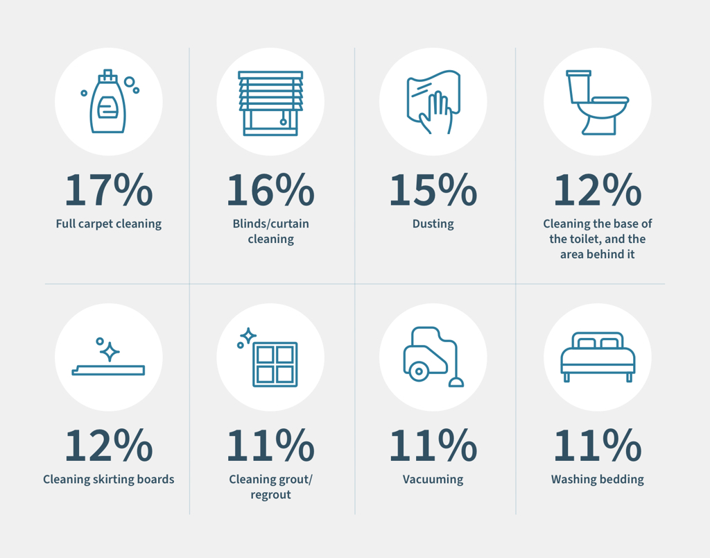 Both genders are also likely to complete the same household tasks in anticipation of a guest, with the top five chores being vacuuming, wiping surfaces, dusting, cleaning/bleaching the toilet and cleaning sinks.