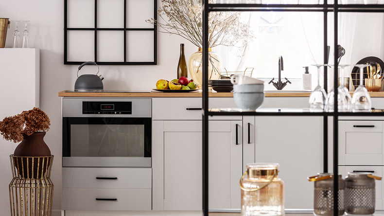 Having built in units all the way up to the ceiling can make your kitchen feel smaller and more cramped, which is why we love open shelving. This is much easier and cheaper to install than fitted cupboards and can make it really easy to find what you're looking for. As it's much simpler to install than built in units, you can also add and remove shelves as your storage needs change.