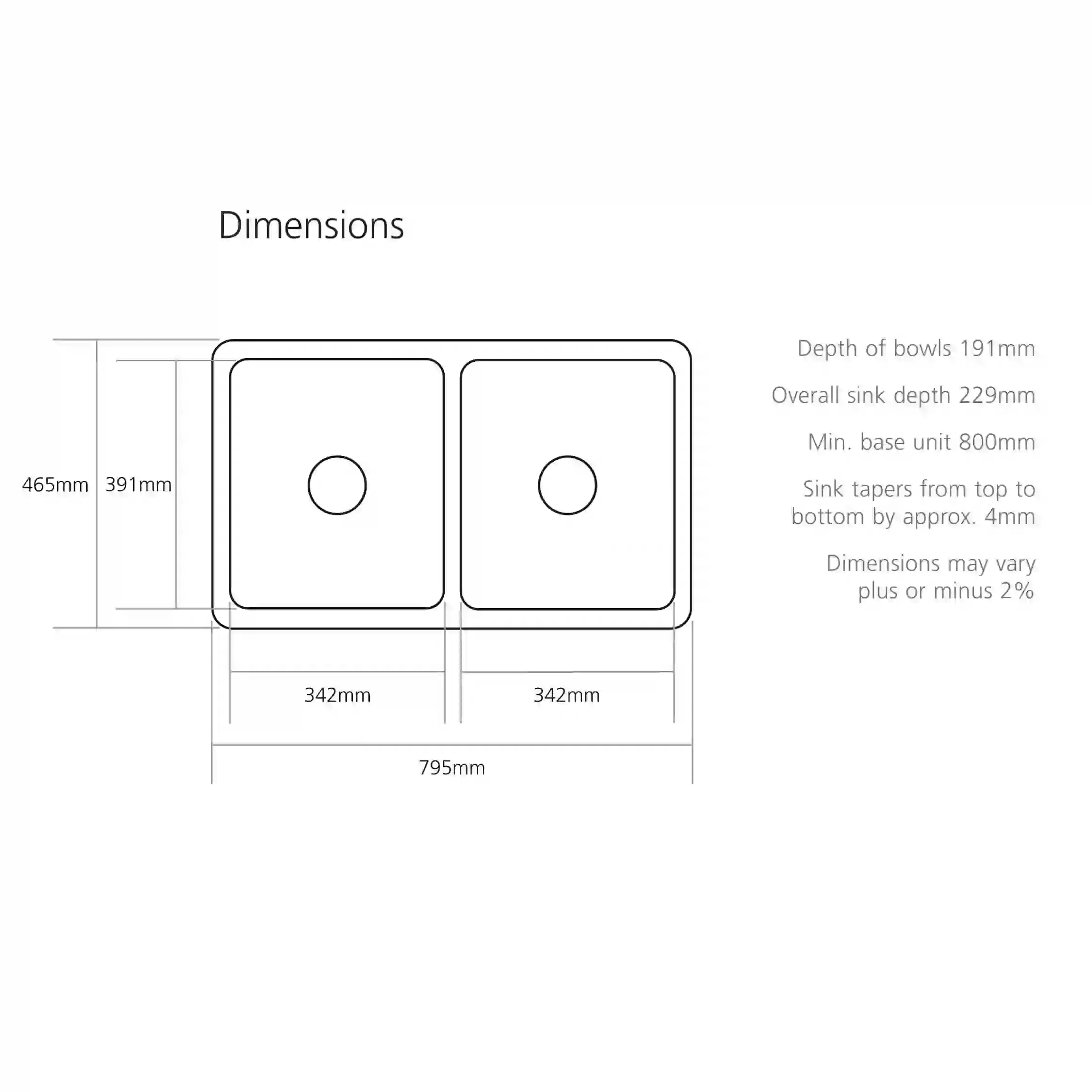 Please note: This ceramic sink may have a tolerance of +/-2% on the specified measurements. This is due to the manufacturing process. As ceramic is a natural material, once it has been fired in the kiln it can expand or contract ever so slightly causing slight fluctuations to the measurements stated above and in the spec box. For this reason, we strongly recommend that you wait until you have received your sink and can measure it for templating purposes before making any cuts in your worktop. If you would like more information, please feel free to contact our sales team here via live chat or email